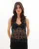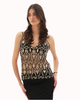 Top confectionnée à la main, ornée de perles et de sequins délicats noirs et dorés, avec un motif floral raffiné. Décolleté en V, fines bretelles en tissu. Semi-transparente.